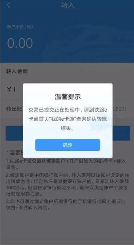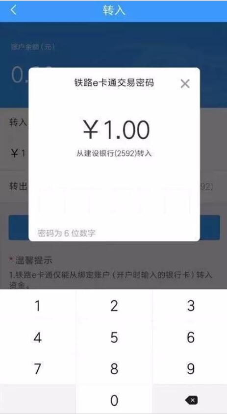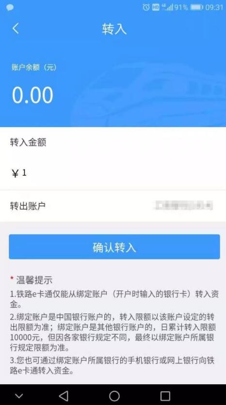 在“鐵路e卡通”首頁進(jìn)入【轉(zhuǎn)入】頁面,界面自動(dòng)顯示當(dāng)前賬戶余額。