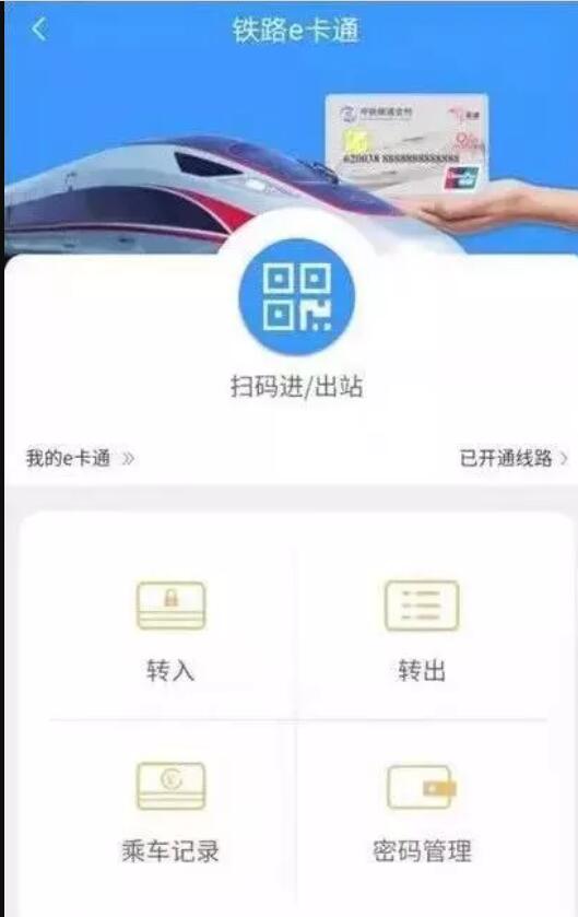“鐵路e卡通”開通后,還需進(jìn)一步生成乘車碼,以便在進(jìn)站時(shí)掃描使用。在“鐵路e卡通”首頁點(diǎn)擊“掃碼進(jìn)/出站”。