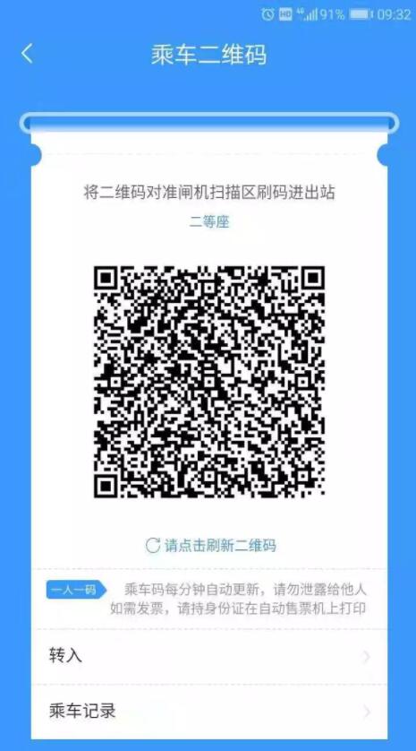 提示:乘車碼僅限本人使用,且默認(rèn)為乘坐二等席,扣除二等席相應(yīng)票款。